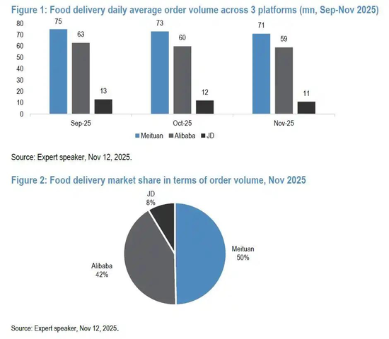▲好意思团、阿里、京东三家外卖市集份额,图源摩根大通