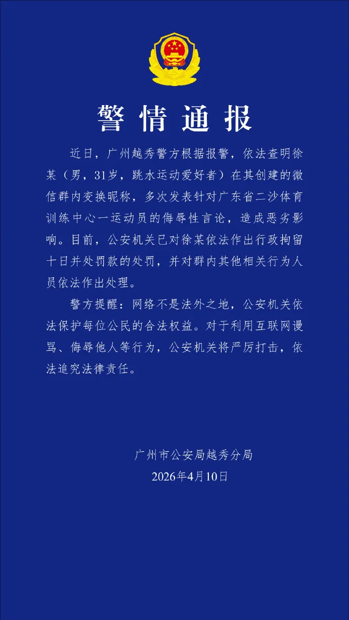 近日,广州越秀警方字据报警,照章查明徐某(男,31岁,跳水领路喜爱者)在其创建的微信群内变换昵称,屡次发表针对广东省二沙体育西宾中心一领路员的侮辱性言论,变成恶劣影响。现在,公安机关已对徐某照章作出行政拘留旬日并处罚金的处罚,并对群内其他有关行径东谈主员照章作出管制。