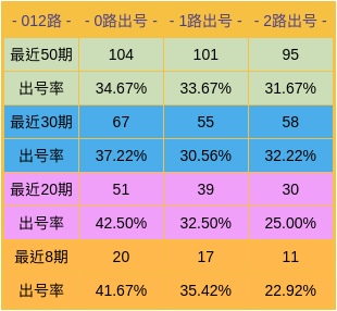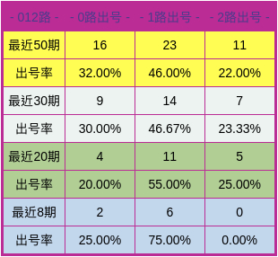 整体走势,通过50期数据对比看,1路较热,0路、2路开出率略低。