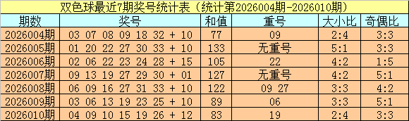 开奖回顾:双色球第2026010期奖号为:04 09 10 15 19 26 + 12,红球和值为83,奇偶比为3:3,大小比为2:4。蓝球开出偶数。