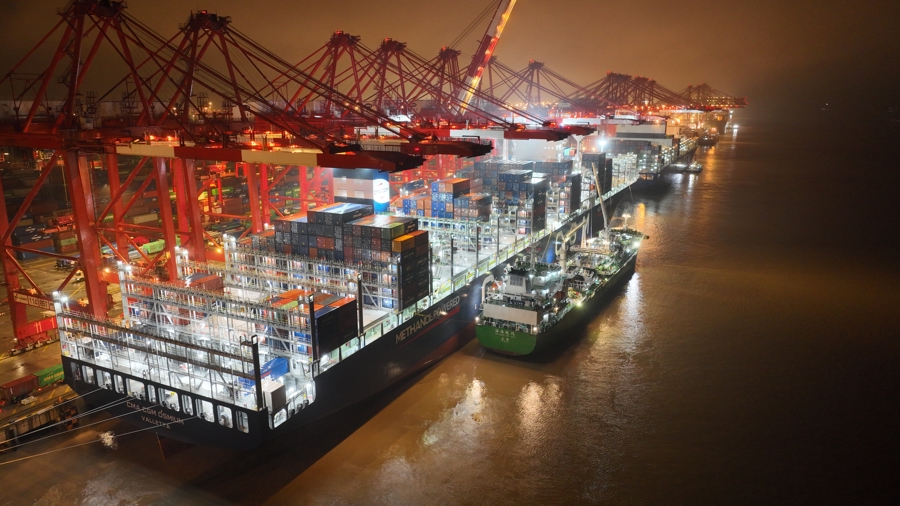 “海港致远”轮对达飞“欧斯米姆”轮进行船对船国产绿色甲醇加注。