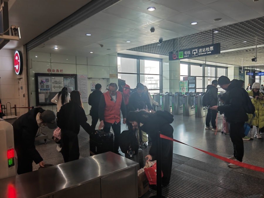 所以,雷总是会特别关注这些来自海外的客人,如果他们表现出迟疑、犹豫,他就会凑近看看是否需要帮助。比如有外籍游客在售票机前反复切换界面,或者盯着线路图看了好久,他就会主动上前提供帮助。“你要去人民广场,点这里没错,这样付款就好了。”“哇你还下载了支付宝和微信,很厉害!”雷很会提供“情绪价值”,末了他会引导旅客到最近的地铁进站口。