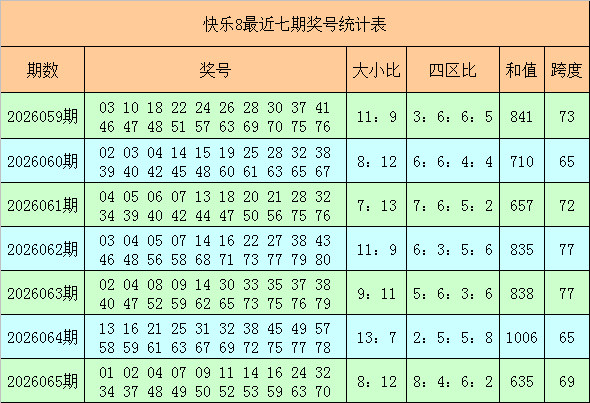 福彩兴隆8第2026065期开出奖号:01 02 04 07 09 11 14 16 24 32 34 37 48 49 50 52 53 59 63 70,其中奖号大小比为8:12,四区比为8:4:6:2,和值为635,跨度为69。
