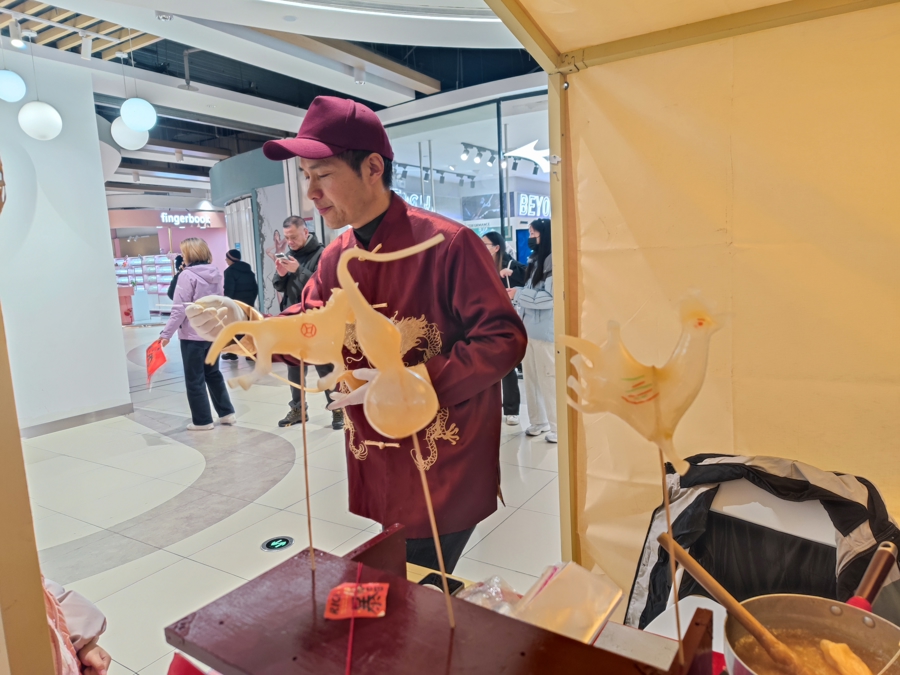 现场,非遗体验区吸引了众多市民驻足。皮影戏、剪纸、面塑、吹糖人等非遗项目吸引众多市民参与。“太奇妙了,一捏一吹间,软糯糖稀就变成了灵动的小猫咪,太有魔力啦!”小朋友参与吹糖人后惊叹道。同时,汉服展示与礼仪教学、猜灯谜、投壶等传统活动也让老少市民沉浸其中,重拾记忆中的年味。