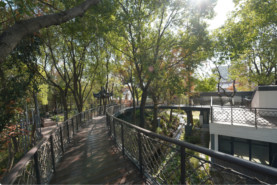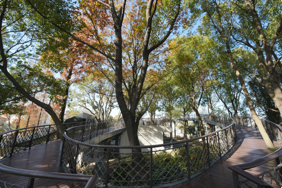 最后来到一片广场,再一次豁然开朗。“旷奥交替”的空间转换,“收”与“放”的对比变化,让树梢漫步的游览路线一直保持新鲜度。