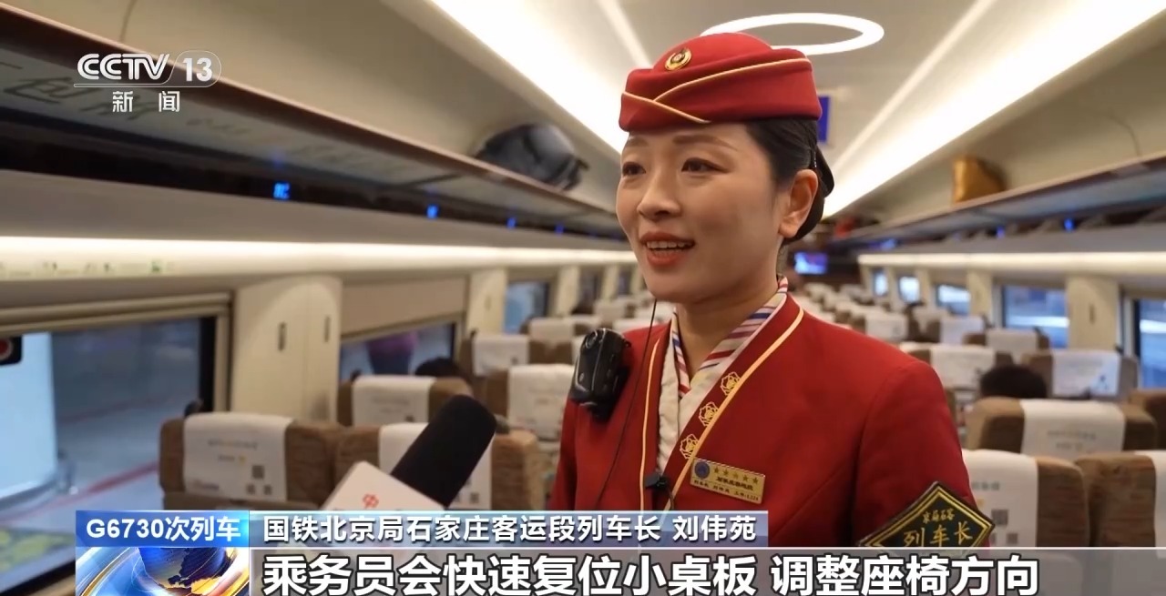 国铁北京局石家庄客运段列车长 刘伟苑:列车换向靠岸技能,乘务员会快速复位小桌板、转机座椅方针,同期对车厢、卫生间等要点区域进行清洁保洁。