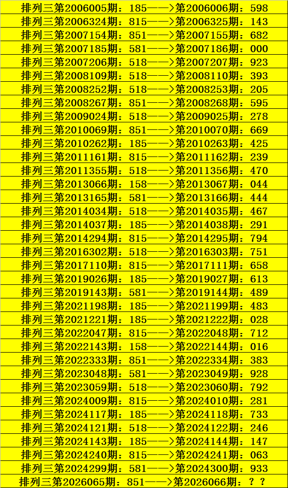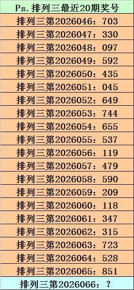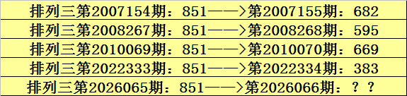 第2026065期成列三奖号为851,历史上该号码直选出现5次,下期奖号分散为:682、595、669、383。