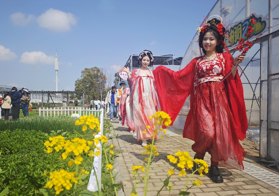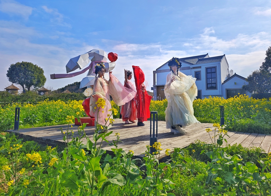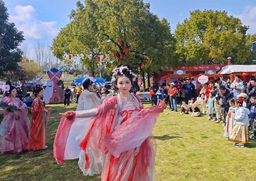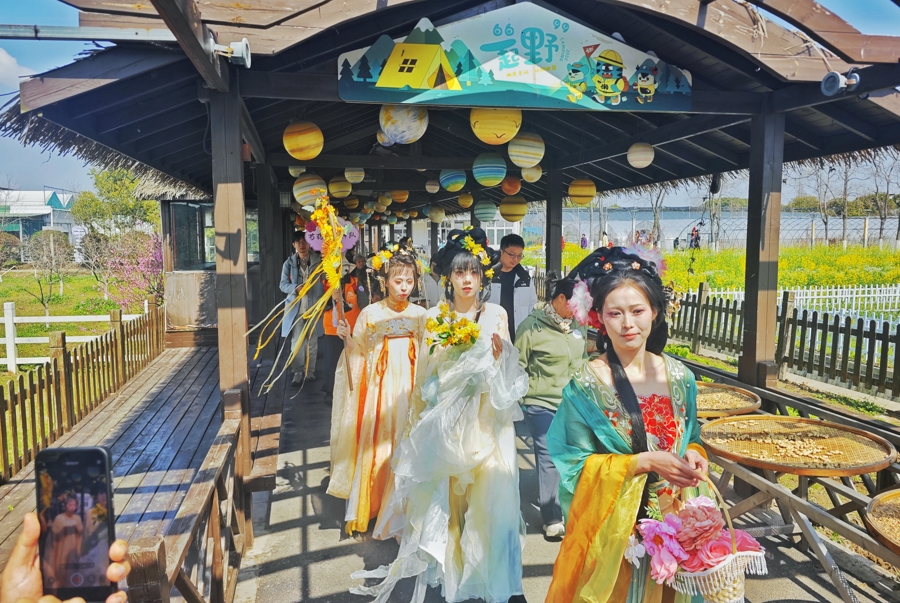 现场,梅花、杏花、桃花等十二位花神身着华服,手执对应花枝,穿梭在朝外花海中与搭客互动,共同千里浸式体验春日任意。